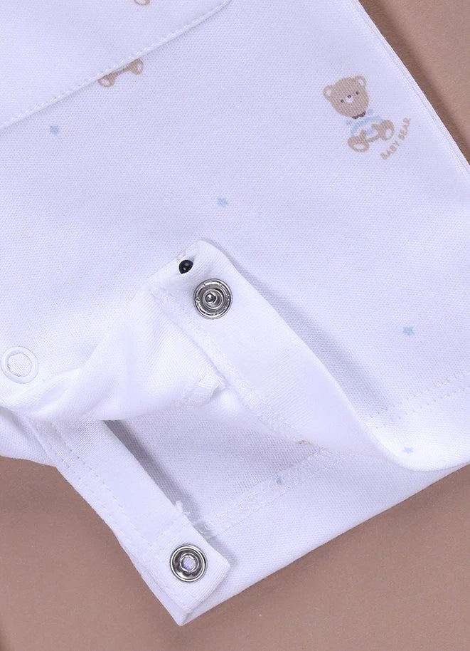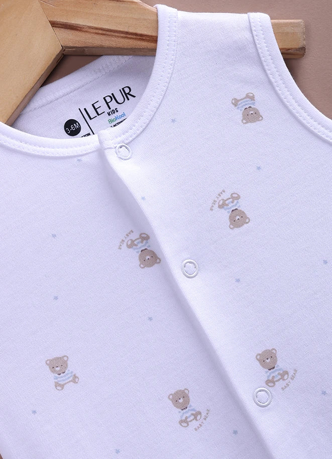 • Soft BioCool cotton fabric • Sleeveless baby romper • Front snap button closure • Cute teddy bear print • Pocket detail design • Comfortable baby fit